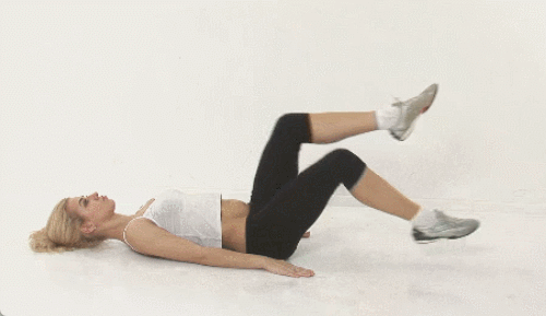 매트에 누운 상태에서 손은 머리 옆으로 옮깁니다. 다리는 공중으로 들어줍니다. 왼쪽 다리를 앞으로 뻗었다가 당기면서 오른쪽 다리를 뻗습니다. 다리를 휘저으면서 1분 동안 반복하세요. 자전거의 페달처럼 움직입니다.