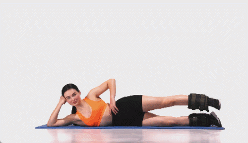 오른쪽 측면을 옆으로 대고 누워서 시작합니다. 오른손으로 머리를 지탱하세요. 왼쪽 다리를 공중으로 들었다가 내리면서 30초 동안 운동합니다. 이번에는 자세를 바꿔서 반대편으로 눕습니다. 오른쪽 다리를 들었다가 내리면서 30초 운동하세요.