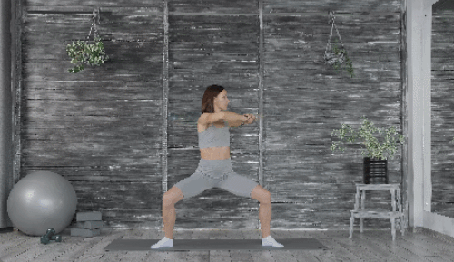 바닥에 서서 다리는 널게 벌려줍니다. 발은 바깥 방향으로 열고, 무릎을 살짝 구부립니다. 손은 팔꿈치를 구부려서 가슴 앞에서 잡아줍니다. 상체를 왼쪽으로 틀었다가 돌아오세요. 이번에는 오른쪽으로 틀었다가 돌아옵니다. 1분 동안 반복하세요.