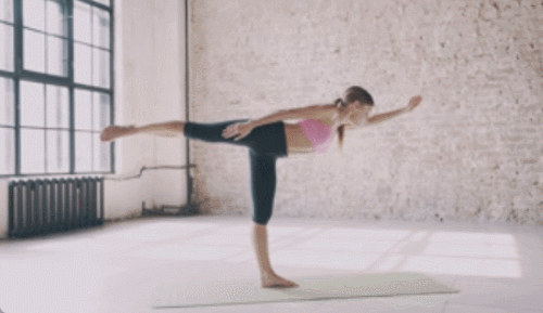 다리를 모으고 매트에 서서 준비하세요. 왼발로 버티면서 오른발을 뒤로 뻗는 동시에 상체를 앞으로 숙입니다. 몸을 T자 모양으로 만들면 되는데요. 시선은 바닥을 향하고, 한 손은 앞으로 뻗습니다. 자세를 유지하면서 호흡하세요. 30초 운동 후, 반대편 다리로 30초 운동합니다.