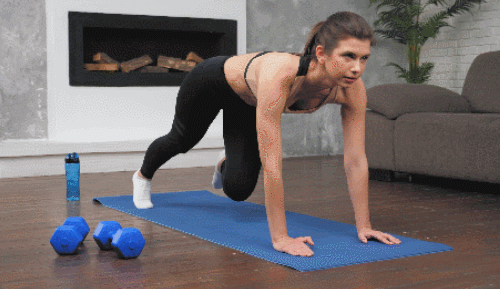 매트에 엎드려서 플랭크 자세로 시작합니다. 오른쪽 무릎을 왼쪽 팔꿈치를 향해 당겼다가 되돌리세요. 왼쪽 무릎을 오른쪽 팔꿈치로 당겼다가 되돌립니다. 다리를 번갈아 크로스 방향으로 당겨주면 되는데요. 1분 동안 운동합니다. 팔꿈치는 편 상태를 유지하세요.