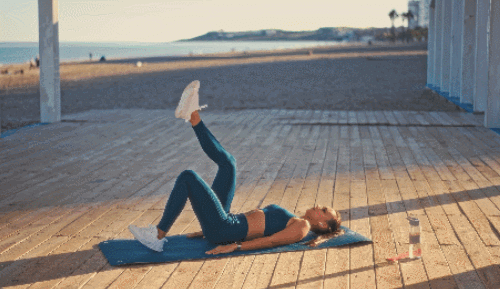 매트에 누워서 준비하세요. 왼쪽 무릎을 세우고 오른쪽 다리는 공중으로 뻗습니다. 엉덩이를 들면서 브릿지 자세를 만듭니다. 30초 동안 업다운 동작을 진행하세요. 이번에는 다리 위치를 바꿔줍니다. 30초 동안 업다운 동작을 반복하세요.