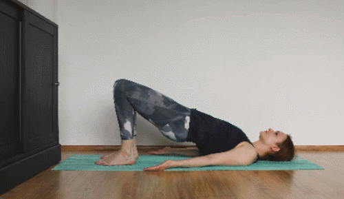 매트에 등을 대고 누워서 준비합니다. 무릎을 당겨서 세우고, 발은 매트에 붙이세요. 엉덩이를 들면서 브릿지 자세를 만듭니다. 무릎에서 어깨까지 이어지는 라인을 맞추세요. 몸을 곧게 뻗어줍니다. 최대한 버텼다가 돌아오세요. 1분 동안 진행합니다.