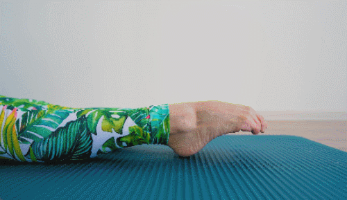 매트에 누워서 발끝을 뻗어줍니다. 발꿈치를 밀면서 발가락을 당겨주세요. 발을 바깥으로 시계 방향으로 돌려줍니다. 이번에는 반시계 방향으로도 돌려주세요. 1분 동안 계속 반복합니다.