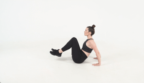 매트에 엉덩이를 대고 앉아서 다리를 펴줍니다. 손을 바닥에 지탱하세요. 상체를 세우면서 무릎을 당겼다가 상체를 눕히면서 다리를 펴줍니다. 복부 전체에 힘을 유지하고, 1분 동안 반복하면 되는데요. 운동 중에는 발이 바닥에 닿지 않도록 합니다.