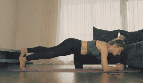 매트에 엎드려서 팔꿈치 플랭크 자세를 잡습니다. 오른쪽 다리를 공중으로 들었다가 내립니다. 이번에는 왼쪽 다리를 공중으로 들었다가 내려주세요. 1분 동안 다리를 번갈아 움직이세요. 시선은 바닥을 응시합니다.