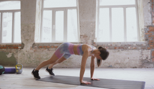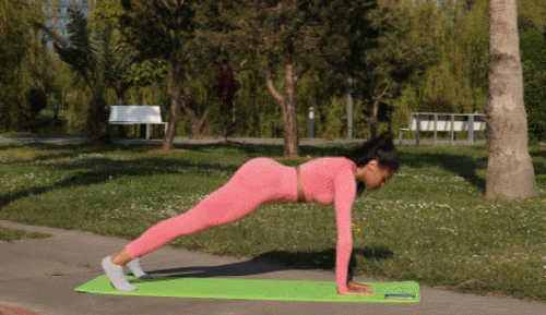 매트에 플랭크 기본자세로 엎드리세요. 엉덩이를 들면서 상체를 내리고 다운도그 자세를 만듭니다. 이때 오른손을 당겨서 왼발로 뻗어줍니다. 원래 자세로 돌아가세요. 이번에는 다운도그 자세를 만들면서 왼손을 당겨서 오른발로 뻗으세요. 1분 동안 반복합니다.