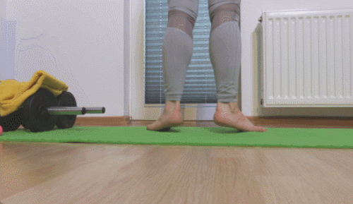 매트에 서서 준비합니다. 발을 바깥 방향으로 틀어주세요. 발꿈치를 동시에 공중으로 들었다가 내려줍니다. 바닥에 완전히 닿기 전에 다시 올려주세요. 몇 번씩 반복합니다. 이번에는 바닥에 완전히 착지한 후, 다시 진행하세요. 1분 동안 운동합니다.