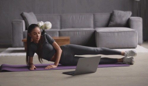 오른쪽 팔뚝을 대고 옆으로 누워서 시작하세요. 왼손은 바닥에 붙입니다. 왼쪽 다리는 공중으로 들었다가 내리면서 운동을 진행합니다. 30초 운동하세요. 반대편으로 돌아서 눕습니다. 오른쪽 다리로 동일하게 30초 반복하세요.