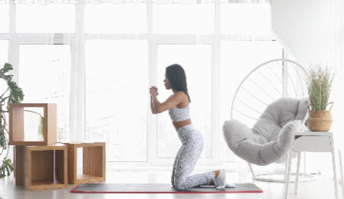 매트에 무릎을 꿇고 앉아서 시작하세요. 상체를 일으켜 세웁니다. 손은 가슴 앞에서 잡으세요. 오른쪽 무릎을 세우면서 오른발을 매트에 붙이세요. 왼쪽 무릎을 세우면서 왼발을 매트에 붙입니다. 스쿼트 자세를 만드세요. 다시 무릎을 바닥으로 내립니다. 1분간 반복하세요.
