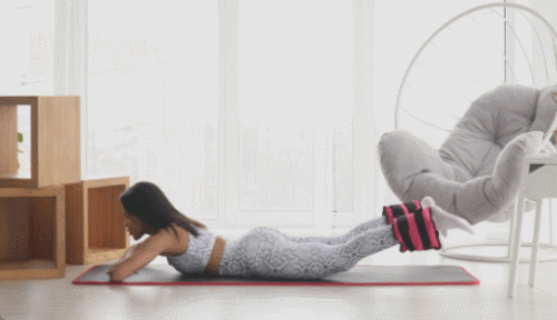 매트에 배를 대고 엎드립니다. 팔은 구부려서 턱밑으로 가져오세요. 다리를 공중으로 들어줍니다. 다리를 벌렸다가 오므리는 동작을 반복하세요. 운동 중에는 발이 바닥에 닿지 않도록 하세요. 1분 동안 운동합니다.
