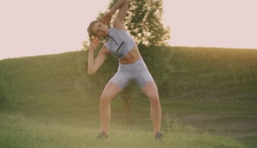 매트에 서서 다리를 넓게 벌립니다. 팔꿈치를 구부리고, 손은 머리 옆으로 이동하세요. 무릎을 살짝 구부립니다. 상체를 오른쪽으로 숙였다가 돌아옵니다. 이번에는 상체를 왼쪽으로 숙였다가 돌아오세요. 1분 동안 반복합니다. 하체는 움직이지 않습니다.