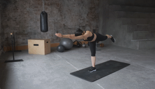 매트에 발을 모으고 서서 시작합니다. 오른발로 버티면서 왼발을 뒤로 뻗으세요. 상체를 앞으로 숙여줍니다. 팔을 앞으로 뻗어서 몸을 T자 모양으로 만드세요. 30초 운동합니다. 왼발로 버티면서 오른발을 뒤로 뻗고, 30초 버티는 동작을 진행하세요.