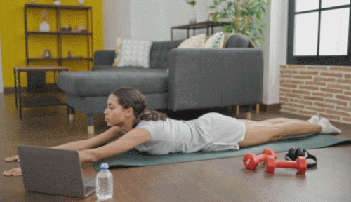 매트에 배를 대고 엎드리세요. 손을 앞으로 뻗어줍니다. 상체와 하체를 동시에 공중으로 올리세요. 손끝과 발끝을 최대한 뻗어주면 되는데요. 자세를 유지하면서 최대한 버텼다가 돌아옵니다. 1분 동안 슈퍼맨 자세를 반복하세요.