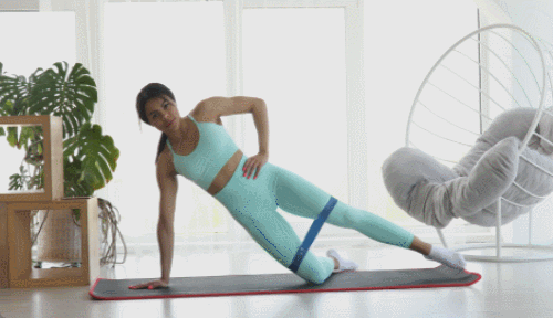 매트에 오른손을 대고 옆으로 눕습니다. 허벅지 사이에는 밴드를 착용하여 운동 효과를 높이세요. 왼손은 옆구리로 가져갑니다. 왼쪽 다리를 공중으로 들었다가 내리면서 운동하세요. 30초 진행합니다. 자세를 바꿔서 오른쪽 다리를 드는 동작을 진행하세요. 30초 운동합니다.