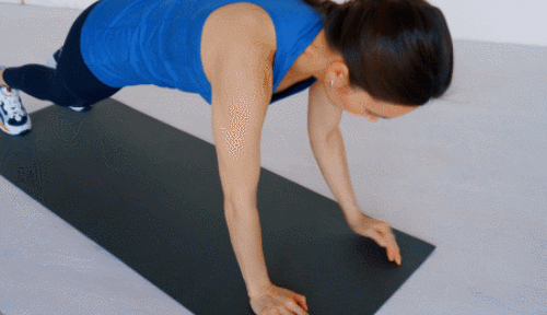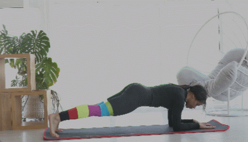 매트에 플랭크 기본자세로 엎드려서 시작합니다. 오른쪽 팔꿈치를 구부리고, 왼쪽 팔꿈치를 구부리세요. 팔꿈치 플랭크 자세로 전환합니다. 팔꿈치를 차례로 펴서 원래 자세로 돌아옵니다. 플랭크 업다운 동작을 반복하세요. 1분간 운동합니다.