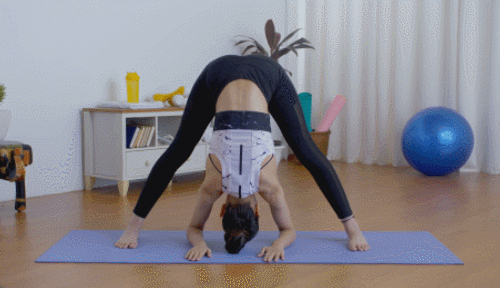 매트에 서서 다리를 넓게 벌립니다. 상체를 앞으로 천천히 숙여주세요. 손을 바닥에 짚거나 팔뚝을 바닥에 대는 자세로 버티세요. 무릎을 펴고, 호흡을 유지합니다. 자신의 신체 상태에서 따라 운동 범위를 조절하세요. 1분 동안 운동합니다.