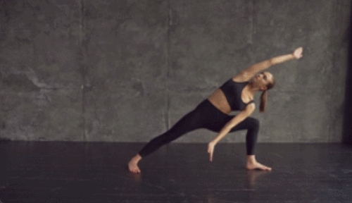 매트에 서서 다리는 넓게 벌립니다. 왼발은 왼쪽 방향으로 틀어줍니다. 왼손을 바닥으로 내리면서 오른손을 공중으로 올리세요. 상체를 반대 방향으로도 움직입니다. 30초 운동하세요. 다리의 위치를 바꿔서 30초 반복하세요.