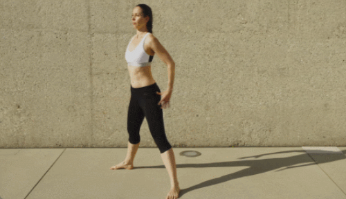 바닥에 서서 다리를 넓게 벌립니다. 손은 가슴 앞에서 모으고, 시선은 정면을 응시합니다. 오른쪽 무릎을 구부리면서 상체를 이동했다가 돌아옵니다. 이번에는 왼쪽 무릎을 구부리면서 상체를 이동하세요. 1분 동안 운동합니다.