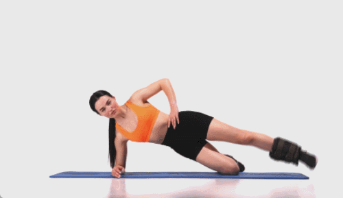 오른쪽 팔뚝을 대고 옆으로 눕습니다. 엉덩이를 들어서 자세를 유지하세요. 왼쪽 다리를 들었다가 내리면서 엉덩이를 같이 내려줍니다. 30초 반복하세요. 이번에는 반대편으로 돌아서 눕습니다. 동일한 방법으로 오른쪽 다리를 움직이세요. 30초 진행합니다.