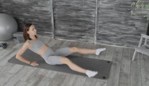 매트에 엉덩이를 대고 앉아서 다리를 펴줍니다. 손을 바닥에 짚으세요. 상체를 뒤로 젖히면서 다리를 공중으로 띄웁니다. 상체를 세우면서 다리를 공중으로 들었다가 원래 자세로 돌아가세요. 다리를 벌렸다가 오므리는 동작을 추가합니다. 1분간 운동합니다.