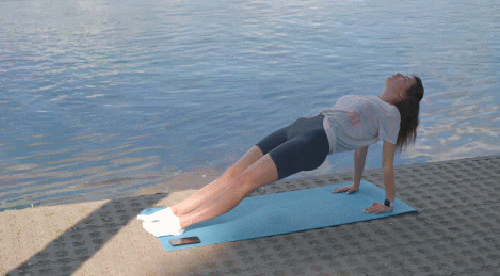 매트에 엉덩이를 대고 앉아서 다리를 쭉 펴줍니다. 손바닥을 바닥에 짚고, 바닥으로 누르면서 몸을 공중으로 띄우세요. 어깨부터 발끝까지 사선으로 라인을 맞춥니다. 자세를 유지하면서 호흡하세요. 1분 동안 리버스 플랭크 자세로 버티는 동작을 진행합니다.