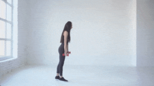 바닥에 서서 손에는 아령이나 생수병을 들어줍니다. 오른발로 버티면서 왼발을 뒤로 뻗어줍니다. 이때 상체를 앞으로 숙이세요. 팔꿈치는 편 상태를 유지하고, 손은 바닥으로 내립니다. 30초 운동하세요. 발을 바꿔서 동일하게 30초 진행합니다.