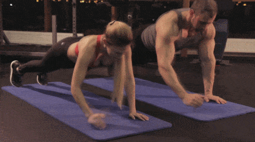 매트에 엎드려서 팔꿈치 플랭크 자세를 잡습니다. 오른쪽 팔꿈치를 펴고, 왼쪽 팔꿈치를 펴주세요. 플랭크 기본자세를 만듭니다. 다시 팔꿈치를 차례로 구부려서 원래 자세로 돌아옵니다. 1분 동안 플랭크 업다운 동작을 진행하세요.