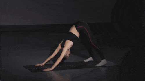 매트에 엎드려서 준비합니다. 엉덩이를 공중으로 높이 들어주세요. 상체를 내리면서 다운도그 자세를 잡습니다. 시선은 발끝을 향하도록 하세요. 팔꿈치와 무릎을 최대한 펴주세요. 호흡을 유지하면서 버팁니다. 1분 동안 반복하세요.