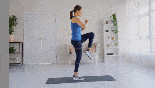 매트에 서서 준비하세요. 손은 가슴 앞에서 모아줍니다. 왼쪽 무릎을 공중으로 들었다가 뒤로 뻗으면서 T 밸런스 자세를 잡습니다. 30초 동안 반복하세요. 이번에는 오른쪽 무릎을 공중으로 들었다가 뒤로 뻗으면서 운동하세요. 30초 진행합니다.