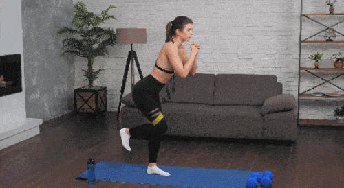 바닥에 서서 다리 사이에는 밴드를 착용합니다. 손은 가슴 앞에서 모아줍니다. 무릎을 살짝 구부립니다. 왼발을 왼쪽으로 이동하면서 사이드 워크 동작을 진행하세요. 이번에는 오른발을 오른쪽으로 이동하면서 반복합니다. 시선은 정면을 향하세요. 1분간 운동합니다.