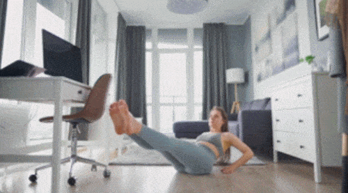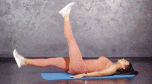 매트에 누운 상태로 다리는 바닥과 90도 각도로 들어줍니다. 왼발을 내렸다가 들어주면서 오른발을 내려주세요. 발을 번갈아 교차하면서 빠르게 움직이면 되는데요. 1분 동안 운동합니다. 운동 중에는 발이 바닥에 닿지 않도록 하세요.