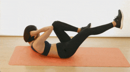 매트에 눕고, 손은 머리 뒤로 보내서 잡습니다. 왼쪽 무릎을 당기면서 상체를 틀었다가 오른쪽 무릎을 당기면서 상체를 틀어줍니다. 운동 중에는 발이 바닥에 닿지 않도록 하고, 상체는 일으킨 상태를 유지합니다. 1분 동안 운동하세요.
