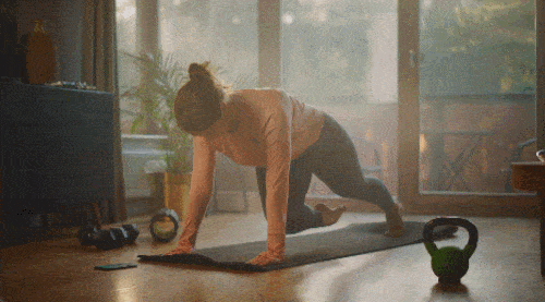 매트에 엎드려서 플랭크 자세로 시작합니다. 오른쪽 무릎을 왼쪽 팔꿈치를 향해 당겼다가 되돌리세요. 왼쪽 무릎을 오른쪽 팔꿈치로 당겼다가 되돌립니다. 다리를 번갈아 크로스 방향으로 당겨주면 되는데요. 1분 동안 운동합니다. 팔꿈치는 편 상태를 유지하세요.