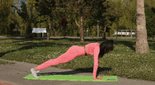 플랭크 동작으로 시작합니다. 엉덩이를 들면서 상체를 낮추세요. 다운도그 자세로 전환합니다. 무릎을 구부리면서 몸을 낮추세요. 다시 플랭크 기본자세로 돌아옵니다. 2가지 동작을 1분 동안 반복하세요. 손과 발이 매트에서 떨어지지 않도록 합니다.