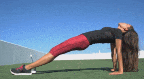 바닥에 앉아서 다리를 펴주세요. 손으로 바닥을 누르면서 엉덩이를 공중으로 띄웁니다. 리버스 플랭크 자세를 만드세요. 어깨에서 발목으로 이어지는 라인을 사선으로 맞춥니다. 몸이 구부정하지 않도록 주의하세요. 1분 동안 버팁니다.