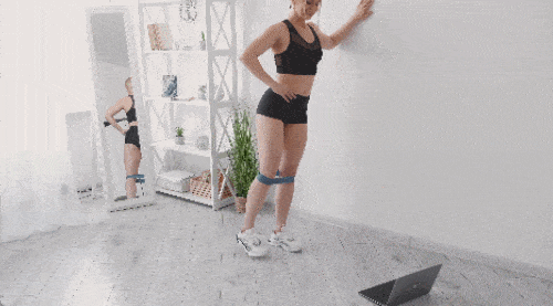 벽 앞에 서서 시작하세요. 다리에는 탄력 밴드를 착용합니다. 왼손으로 벽을 지탱하세요. 오른쪽 다리는 옆으로 드는 동작을 반복합니다. 30초 진행하세요. 무릎은 완전히 편 상태를 유지합니다. 반대편으로 돌아서 왼쪽 다리를 드는 동작을 30초 반복합니다.