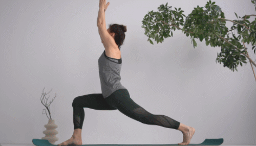 매트에 발을 모으고 서서 시작하세요. 오른발을 앞으로 크게 내딛고, 무릎을 90도로 구부립니다. 왼쪽 다리는 뒤로 뻗은 상태를 유지합니다. 상체를 꼿꼿하게 세우고, 팔을 머리 위로 뻗으세요. 30초 버팁니다. 다리 위치를 바꿔서 30초 버티세요.
