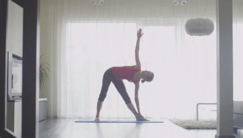 매트에 서서 다리는 넓게 벌립니다. 그리고 왼발은 왼쪽 방향으로 틀어줍니다. 그런 다음 왼손을 바닥으로 내리면서 오른손을 공중으로 올리세요. 상체를 반대 방향으로도 움직입니다. 30초 운동하세요. 다리의 위치를 바꿔서 30초 반복합니다.