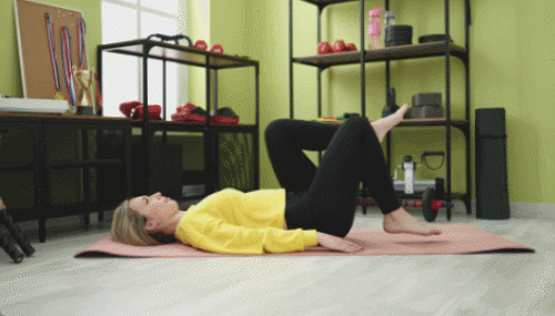 매트에 등을 대고 누우세요. 무릎을 구부리고, 발바닥을 바닥에 평평하게 붙입니다. 엉덩이와 허리를 바닥에서 들어 올려, 어깨부터 무릎까지 일직선이 되도록 합니다. 이때 복부와 엉덩이 근육에 힘을 주어 자세를 유지하세요. 엉덩이를 들었다가 내리는 동작을 1분 동안 반복합니다.