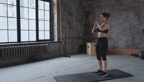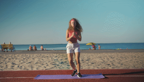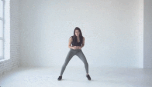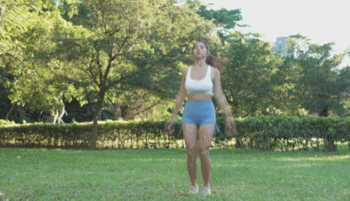 바닥에 서서, 손은 복부 앞에서 모으고, 상체는 약간 숙입니다. 시선은 정면을 향합니다. 다리를 옆으로 벌렸다가 모으면서 제자리에서 뛰는 동작을 반복하면 되는데요. 1분 동안 지속적으로 반복합니다.