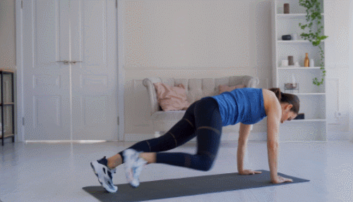 매트 위에 플랭크 자세로 시작합니다. 왼쪽 다리를 바깥쪽으로 당기면서 무릎을 왼쪽 팔꿈치 쪽으로 이동합니다. 이번에는 오른쪽 다리를 오른쪽 바깥 방향으로 당기면서 무릎을 오른쪽 팔꿈치 쪽으로 이동합니다. 왼쪽과 오른쪽 다리를 번갈아 가며 이 동작을 1분 동안 반복합니다.