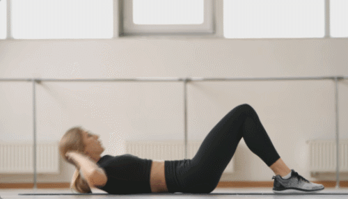 매트에 등을 대고 누워서 무릎을 구부립니다. 발은 바닥에 평평하게 놓으세요. 손은 머리 뒤에 놓고 손가락을 서로 교차시켜 머리를 약간 지지합니다. 상체를 천천히 일으키세요. 이때 허리는 바닥에 밀착시킨 상태로 유지하고, 복부에 힘을 주어 자극합니다. 이 동작을 1분 동안 반복합니다.