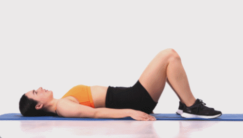 매트에 등을 대고 누워서 무릎을 구부리고, 발바닥은 바닥에 단단히 고정합니다. 엉덩이와 허리를 바닥에서 들어 올려 몸이 어깨에서 무릎까지 일직선이 되게 합니다. 잠시 유지한 후, 몸을 바닥으로 내려 엉덩이가 바닥에 닿게 합니다. 이 동작을 1분 동안 반복합니다.