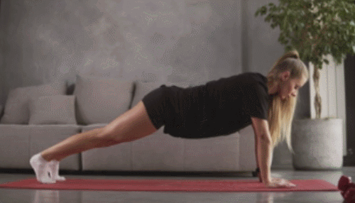 매트에 플랭크 자세로 엎드립니다. 오른쪽 팔꿈치를 구부려 매트에 닿게 한 뒤, 왼쪽 팔꿈치도 마찬가지로 구부려 팔꿈치 플랭크 자세를 만듭니다. 이제 오른쪽 팔을 먼저 펴서 시작 자세로 돌아오고, 그다음 왼쪽 팔도 펴서 플랭크 자세를 완성합니다. 1분 동안 반복합니다.
