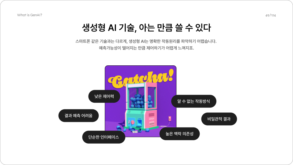 사실 그래서 좀 안타까운 게, 보통 '원리 설명은 지루하고 쓸모없다'고 지레 단정짓는 경우가 많은데 다른 기술과 달리 생성형 AI는 이렇게 하이레벨에서라도 이해를 하면 훨씬 쓰는 데 수월해지는데... 이걸 진행 전에 미리 설득하기가 쉽지는 않다는 것이다. 그래도 담당자와 미리 이야기를 잘 해서 협의가 되는 경우도 있어서, 아주아주 기초적인 원리를 정말 하이레벨로 조금 풀어서 진행을 한 적도 있다. 사실 나조차도 준비하면서 이런 걸 사람들이 궁금해하는 게 맞나? 괜히 지루해하는 거 아니야? 이런 생각을 하기도 했다.