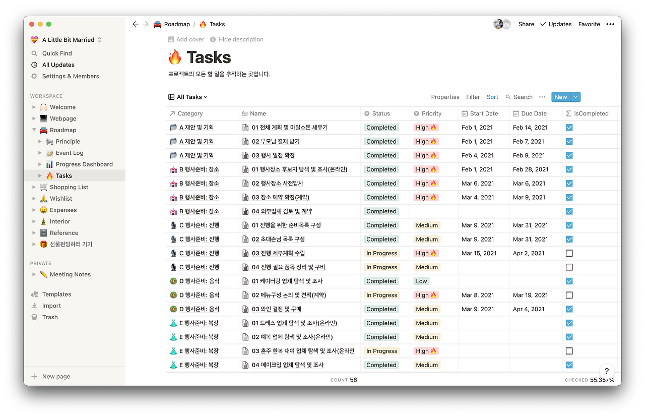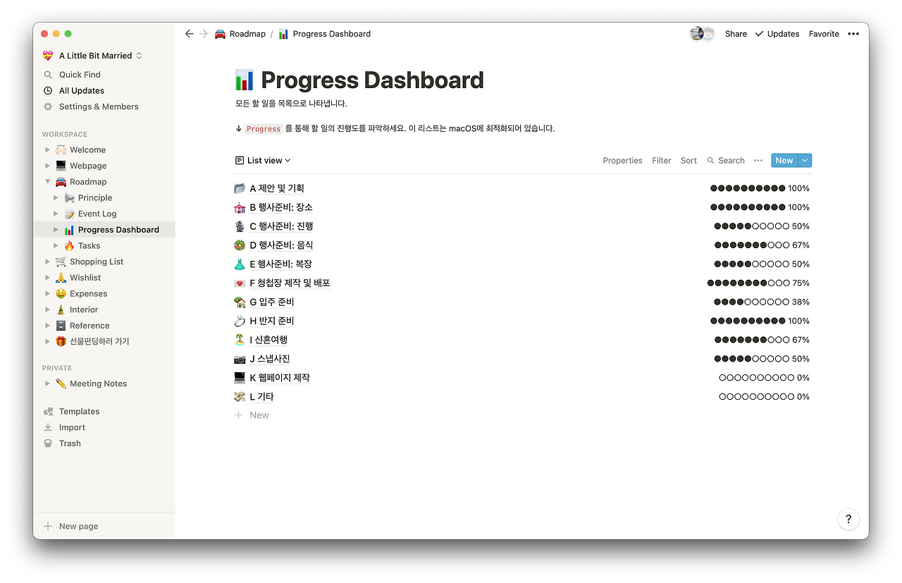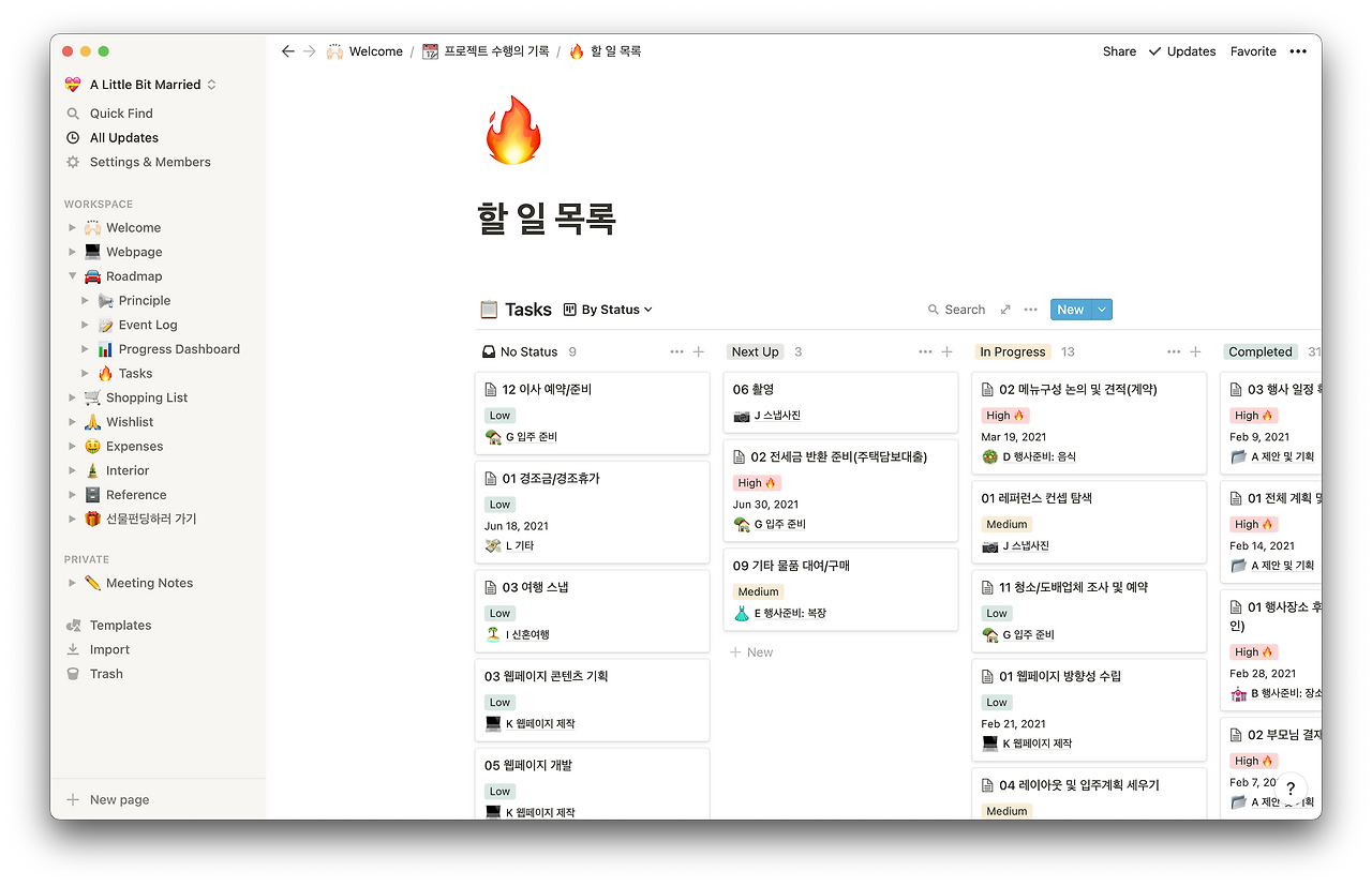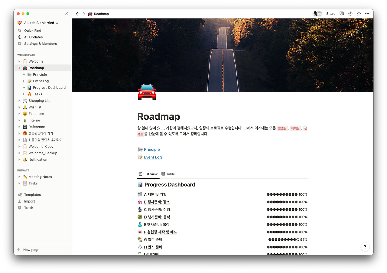 인프피인 배우자에게는 살짝 버거웠던 프로젝트의 촘촘한 계획과 수행. 지금 와서 다시금 고맙다는 인사를... 로드맵 페이지를 만들고, 12개의 중간 레벨 이상의 카테고리(많다...)를 만들고, 각 카테고리 아래에 세부 할 일들을 할당하고 그것들의 진행상황을 다시 대시보드로 만들어서 관리하는 뭐 그런 체계를 세워서 일을 진행했습니다. 지금 보니 조금... 숨막히는 것 같기도?