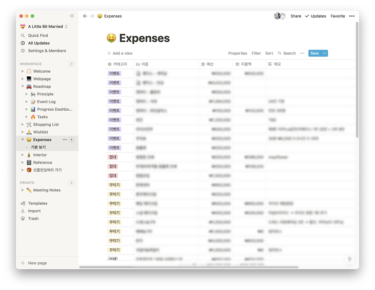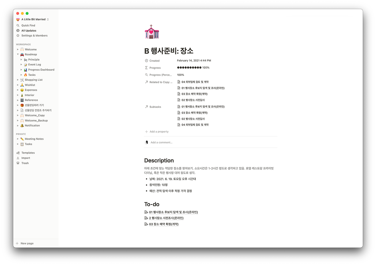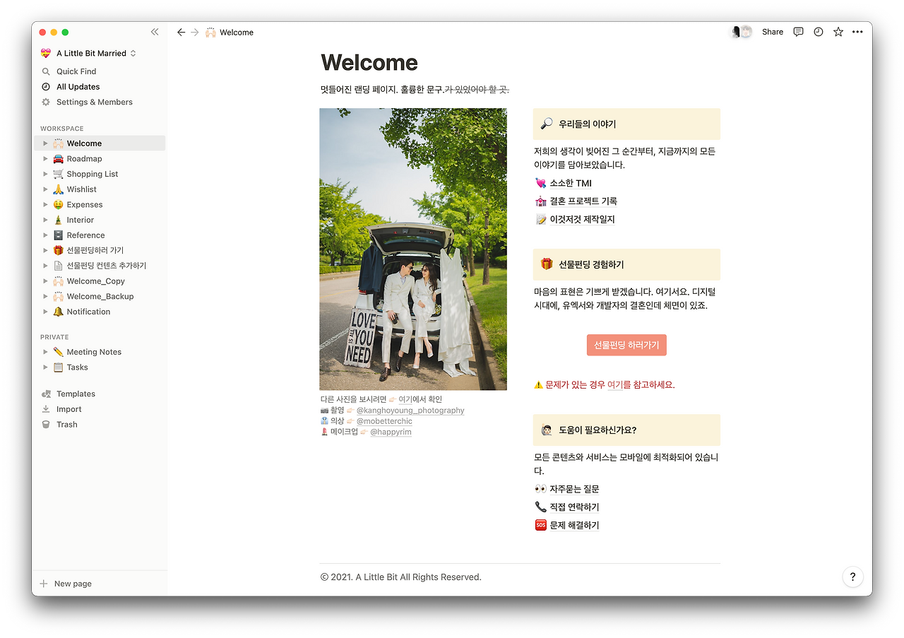 하여튼 어떤 일이 있고, 무엇을 결정하고 이런 히스토리들을 보관할 필요가 있었는데 다양한 툴들이 있지만, 일종의 협업 프로젝트이니 노션(Notion)을 활용해서 이 일을 처리해보기로 했습니다. 결혼 준비하시는 많은 분들이 구글 시트, 엑셀, 카페, 블로그를 활용하며 나름대로의 방식을 활용하고 계시는데, 노션도 그중 하나의 선택지가 될 수 있을 것 같으니 한 번 고려해보는 것도 추천드립니다.