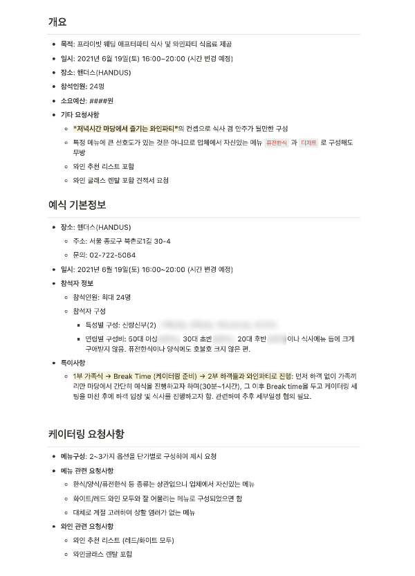 핸더스 계약 후, 핸더스 실장님으로부터 컨택정보를 받아 앤파티의 담당 실장님께 연락을 드렸습니다. 너무도 친절하신 실장님의 안내에 따라 원하는 내용을 정리해서 보내드리기로 했습니다. 그래서 저희의 요구사항을 아래와 같이 간단히(?) 정리해서 보내드렸습니다. 지금 보니 조금... 정리가... 과한 것 같기도...