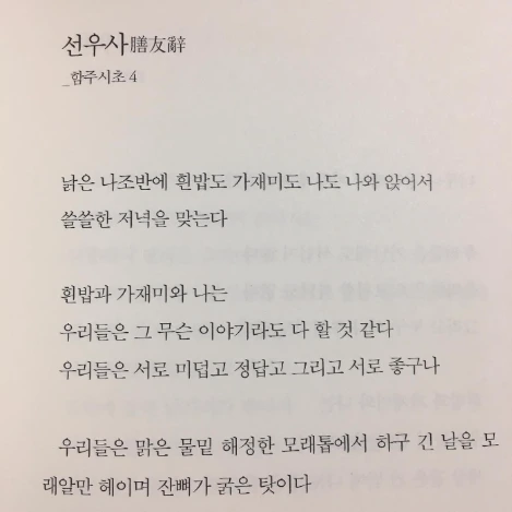 내가 백석 시인을 좋아하는 이유 중 하나는 동물을 바라보는 그의 따스한 시선이다. 인간의 입장에서 동물을 바라봤다기 보다 동등한 위치에 두고 바라본다. 그 시선에 크게 공감하여 그의 시 속에 등장하는 모든 동물을 찾아 소논문을 쓴 적도 있다. 만나뵌 적은 없지만 그는 생명과 자연을 사랑한 무척 따뜻한 분이었을 것이다.